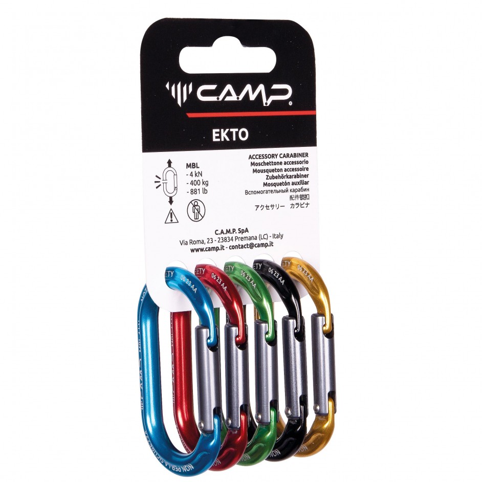 De Camp Ekto is een accessoirekarabiner, specifiek ontwikkeld voor professioneel gebruik waarbij maximale duurzaamheid en een laag gewicht vereist zijn. Geschikt voor niet-veiligheidskritische toepassingen zoals organiseren van materiaal op het harnas, het vastzetten van uitrusting of als kleurcodering. De Ekto is gefabriceerd uit 7075 aluminiumlegering, heeft een bedrijfssterkte van 4 kN en wordt per vijf stuks geleverd in verschillende kleuren. Let op: dit product is niet bedoeld voor levensbeveiligende toepassingen.