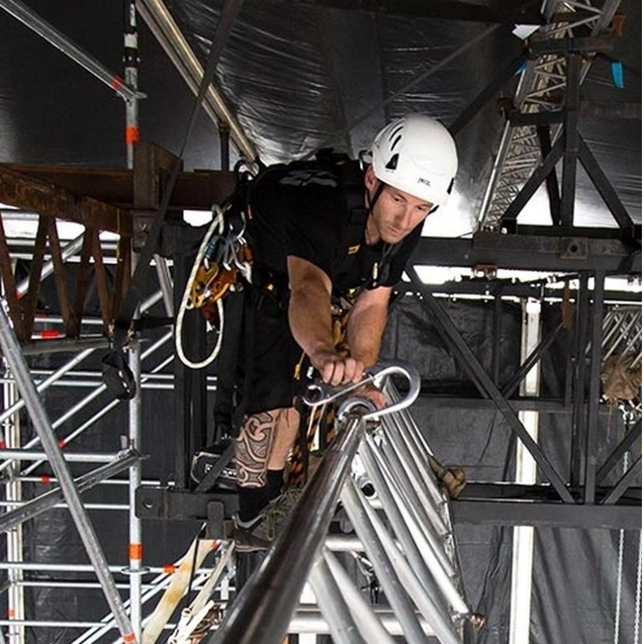 Beveiligingslijn Y met grote steigerhaken. Hiermee maakt u zichzelf tijdens het klimmen vast aan de structuur, bij een eventuele val wordt de val opgevangen door het uitscheuringsmechanisme. Hierdoor voorkomt u lichamelijk letsel. De gebruikte lijn is de Vertiqual Magnum Flex.