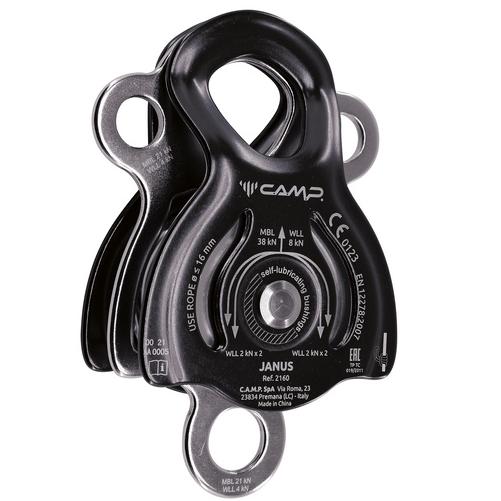 De Camp Janus is een multifunctionele, hoogwaardige dubbele pulley ontworpen voor het aanleggen van takelsystemen en complexe hijsoperaties in professionele veiligheidsomgevingen zoals rope access en redding. Geschikt voor touwen tot Ø16 mm en voorzien van een hoofdbevestiging voor drie karabiners, een grote becket en twee secundaire bevestigingspunten voor flexibele positionering en toepassing van progressieblokkeringen (Prusik). Verkrijgbaar in rood en zwart. De constructie bestaat uit aluminium legering en roestvrijstalen as. Voldoet aan EN 12278.