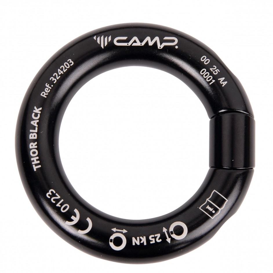 De CAMP Thor is een hoogwaardige aluminium ringconnector, specifiek ontwikkeld voor toepassingen waarbij absolute betrouwbaarheid en gecertificeerde veiligheid noodzakelijk zijn. De Thor is gecertificeerd conform EN 362:2004 (klasse M), EN 12275:2013 (klasse Q), EN 17961:2025, EN 17109:2020+A1:2024, en ANSI/ASSP Z359.12-2019. Het product is ontworpen voor zware industriële toepassingen zoals bouw, rope access, onderhoud, rescue en klimparken, waarbij een semi-permanente, te openen verbinding vereist is. De Thor biedt een gegarandeerde gegarandeerde breeksterkte van 25 kN in alle configuraties (MBL), een maximale werkbelasting van 10 kN (WLL) en is geschikt voor gebruik met metalen kabels (ø 10–14 mm), ankerpunten, lanyards en harnassen in veeleisende omstandigheden. De Thor mag uitsluitend door competent, getraind personeel worden toegepast, waarbij opening onder belasting strikt verboden is.