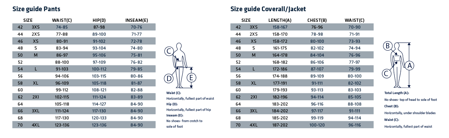 Onder het kopje Downloads staan twee datasheets met overzichtelijke info omtrent deze twee modellen Rope Access werkoveralls en de bijbehorende maattabel