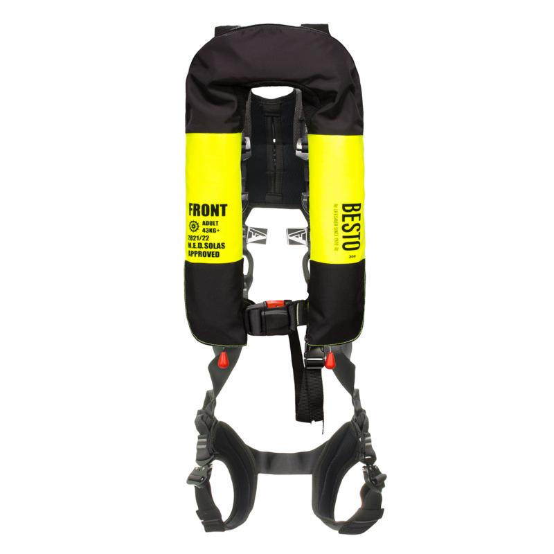 Reddingsvest met minimaal 300 Newton drijfvermogen, volledig geïntegreerd en eenvoudig aan- en uit te trekken.