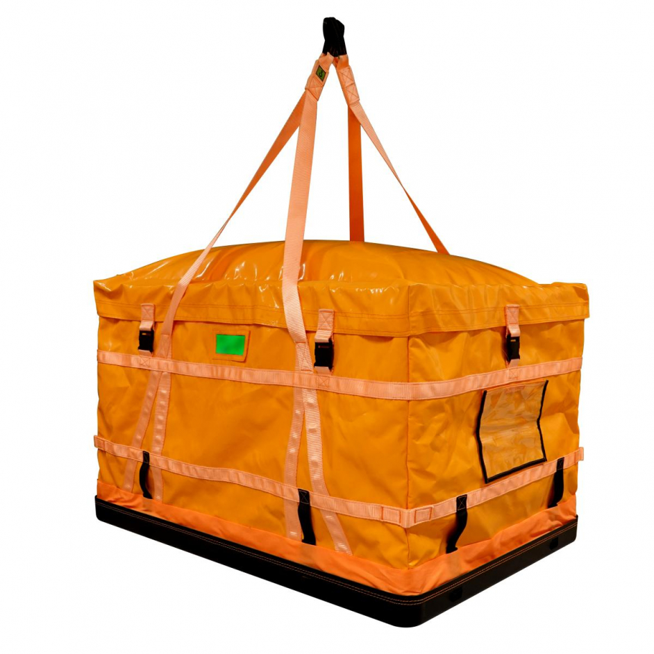 The EMG 5618 Giant Lifting Bag with Inflatable Lid is a robust lifting bag designed for professional use in rope access, construction, and industrial sectors. Constructed from 0.75 mm water-repellent tarpaulin, it allows for safe lifting of loads up to 1000 kg (WLL) with a volume of 930 litres. The updated design features an inflatable lid for effective rain drainage. Removable hard internal walls and a foamed PVC base ensure optimal protection and weight distribution. Equipped with sturdy 50 mm polyamide lifting straps, a detachable transparent documentation pocket, and practical plastic buckles. Complies with EN 1492-1 and ISO 21898.