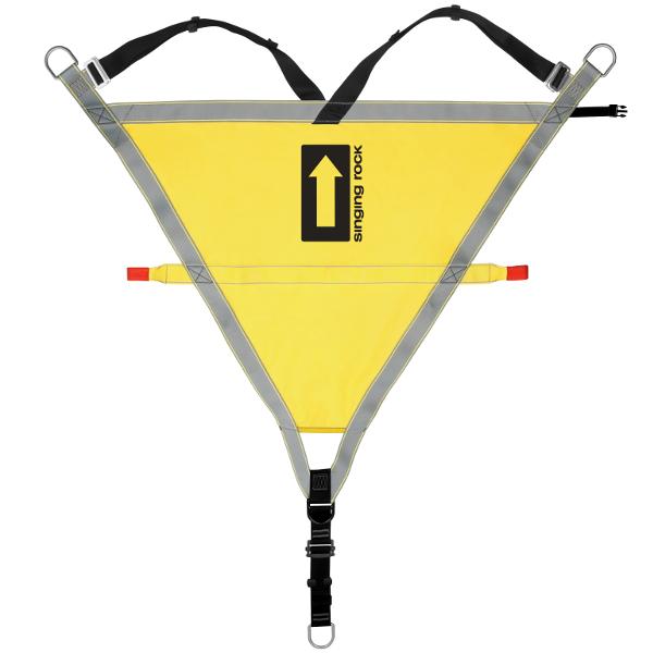 Het ontwerp van de Singing Rock Evacuation Triangle Combi II is simpel opgebouwd. Het bestaat uit een opvallend geel waterafstotend vlak in de vorm van een driehoek met aan elk uiteinde van de driehoek een stalen D ring. Aan de bovenzijde zitten twee schouderbanden die in de gewenste lengte kunnen worden ingesteld, middels een doorvoergesp. De schouderbanden kunnen tevens los gemaakt worden door het draaien van de gesp, wat het aan- en uittrekken gemakkelijker maakt (zie visuele toelichting tussen de afbeeldingen). Aan de onderzijde zit tevens een band die in lengte kan worden ingesteld. Het harnas mag max. belast worden tot 150 kg.