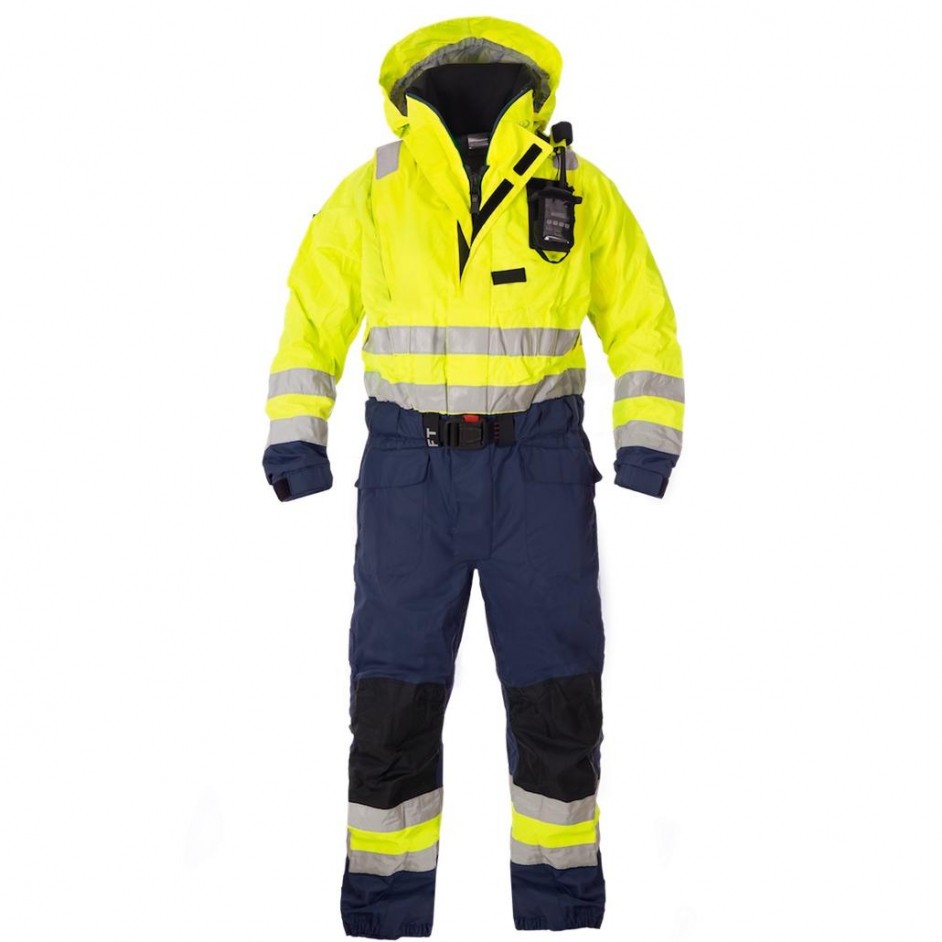 Dit beschermende pak van KI-Suit is ontwikkeld voor professioneel gebruik in de maritieme, industriële en bouwomgeving waar blootstelling aan koude, water en slechte weersomstandigheden een risico vormt. Het pak is gecertificeerd voor bescherming tegen hypothermie (minimaal 1 uur bij <5 °C), regen en verhoogde zichtbaarheid, en is voorzien van een geïntegreerd SOLAS 310N reddingsvest. Geschikt voor gebruik met PBM’s als helmen en communicatieapparatuur. Leverbaar in maten S t/m 3XL voor optimale pasvorm.