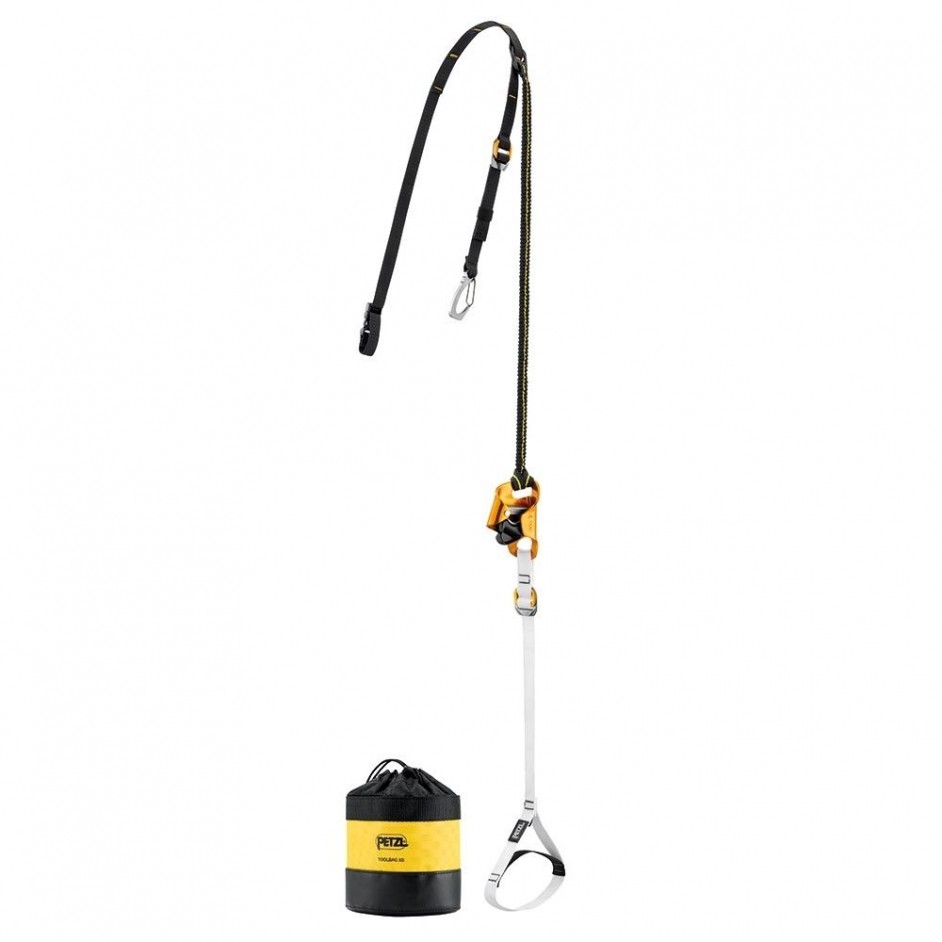 De Petzl Knee Ascent Loop bestaat uit een bandlus bovenaan, een Croll L stijgklem, een bandlus onderaan voorzien van een voetlus en een Toolbag materiaaltas.