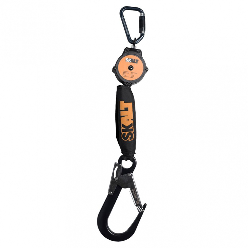 Standaard wordt het valstopblok geleverd met één Skalt Comito karabiner en één Skalt Grando steigerhaak (50 mm opening) aan het uiteinde van de band. De geïntegreerde schokdemper en robuuste polymeerbehuizing met anti-shock eigenschappen verhogen de veiligheid en duurzaamheid in intensief dagelijks gebruik.